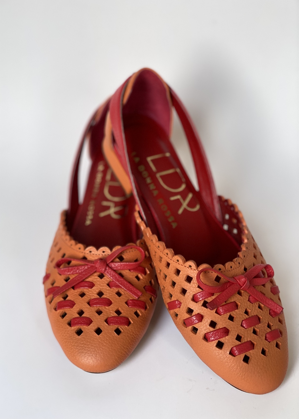 Sandalias estilo princesa con punta redonda en mini floater color naranja, negro o champagne. Troquelado en forma de mini rombos con tiras posteriores y lazo en cuero rojo cherry. Interior en badana roja. Taco de 1.5 cm.