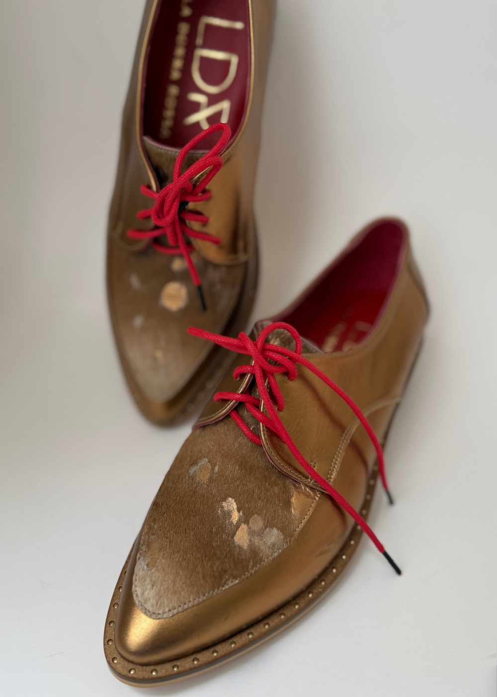 Oxford con punta afilada en cuerpo metálico plateado o dorado, frente en pelo natural con manchas en tono perlado, pasadores rojos transparentes y con tachuelas sutiles en la suela. Taco de 3 cm.