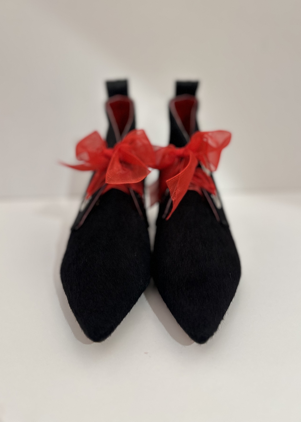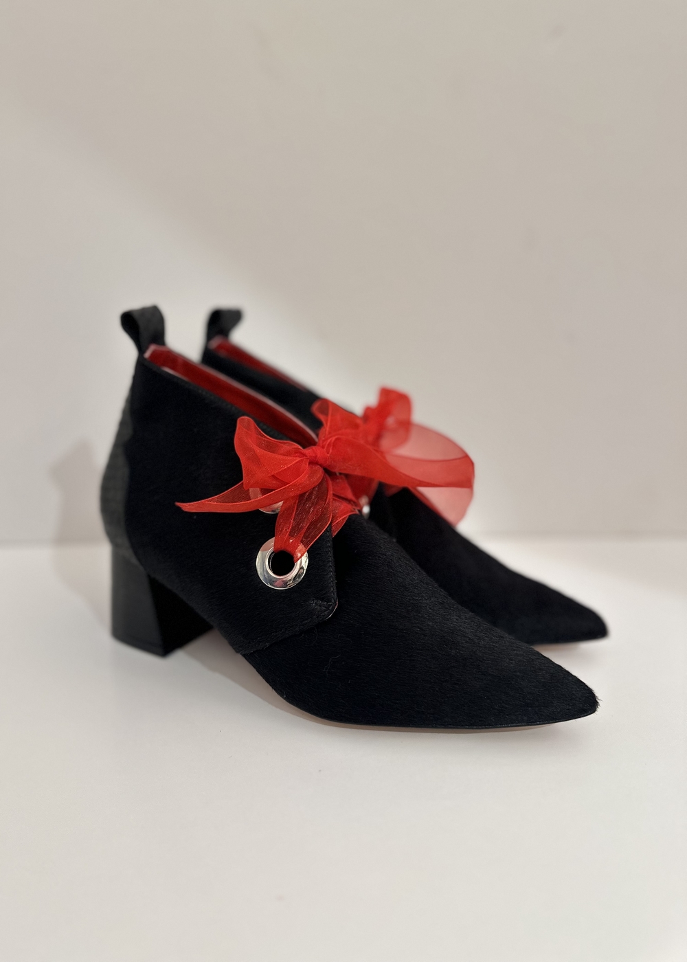Botín con 2 texturas de cuero: en el cuerpo cuero de pelo negro y en la parte posterior cuero de escamas negro. De punta fina y tacón de 5 cm, ancho y medio; con ojales metálicos plateados y con un lazo de organza roja translúcida. Interior en badana roja.