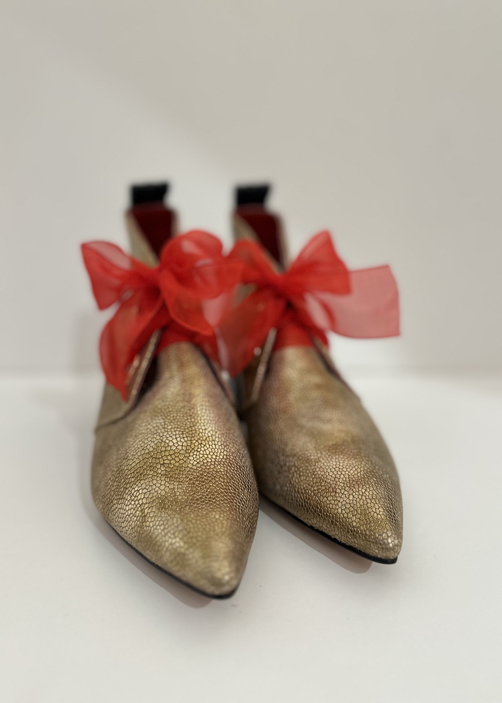 BotÃn con 2 texturas de cuero: en el cuerpo cuero dorado tipo camuflaje y en la parte posterior cuero de escamas negro. De punta fina y tacón de 5 cm, ancho y medio; con ojales metálicos plateados y con un lazo de organza roja translúcida. Interior en badana roja.
